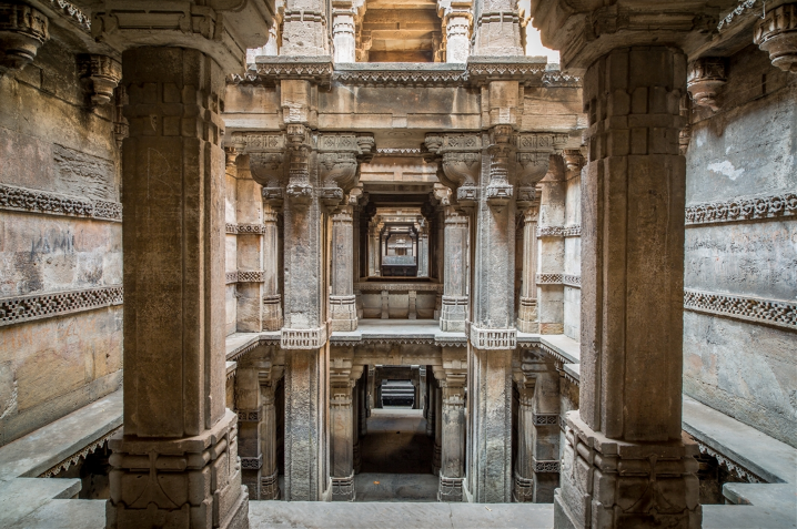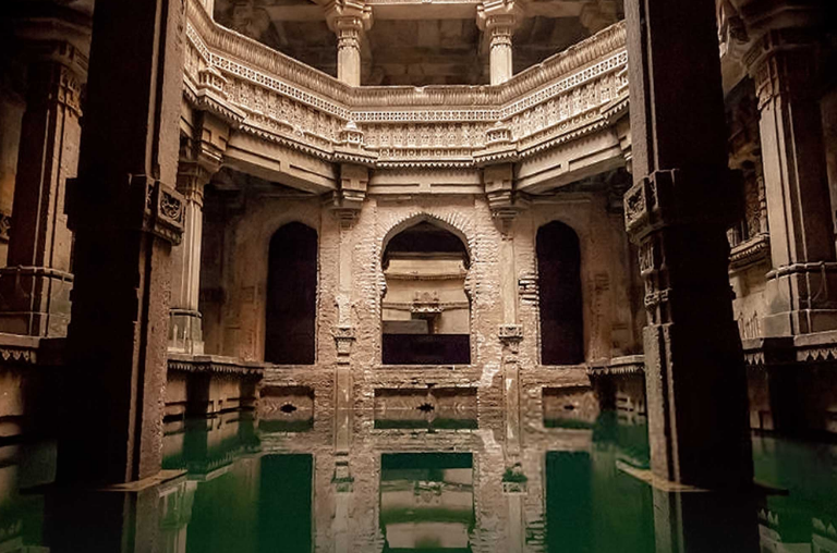 The stepwell is adorned with intricate carvings of floral motifs, mythological scenes, and geometric patterns. Its unique design allows sunlight to filter through beautifully, creating mesmerizing light and shadow effects on the walls. The structure also reflects a blend of Hindu and Islamic craftsmanship, making it a rare architectural gem.