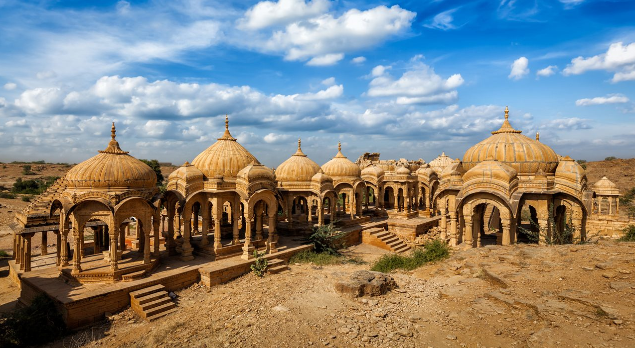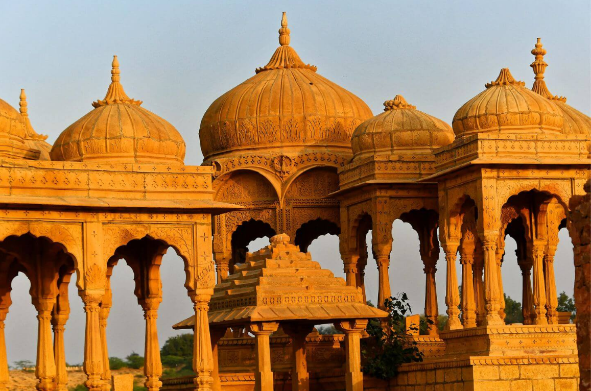 The cenotaphs are carved from golden-yellow sandstone, beautifully decorated with intricate designs, and set against the backdrop of the desert landscape. Each chhatri is dedicated to a king or queen of Jaisalmer, and together they create a breathtaking view, especially during sunrise and sunset, when the golden structures glow with the desert light.